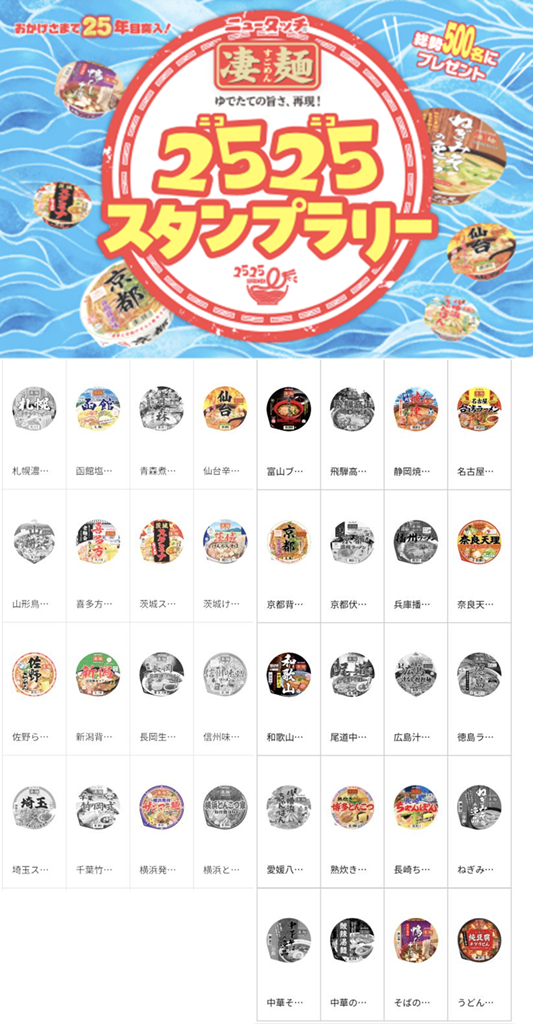 ニュータッチ「凄麺」シリーズの「2525凄麺スタンプラリーキャンペーン」なるものが12/15まで開催中でして。